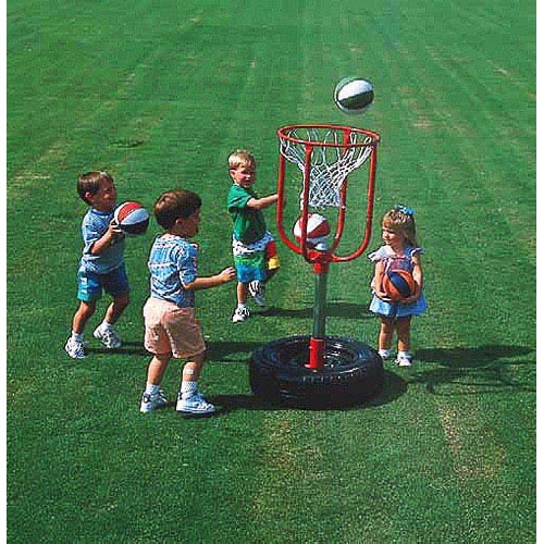This metal basketball goal promotes cooperative play, while developing hand-eye coordination and gross motor skills. It can be attached to a car rim and tire for portability, or permanently anchored with concrete (tire and rim not supplied.)