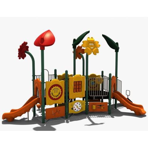 Maximo playgrounds are artistically crafted with your choice of 5.0" OD galvanized steel or aluminum support posts which are, along with all of the steel handrails, barriers, gates, and climbers, coated with a baked-on polyester powder coat finish for a lifetime of protection against the elements. All steel decking and stairs are encased in a longĀlasting PVC coating. The three-dimensional plastic slides, panels, roofs, and climbers are rotationally molded using virgin compounded resins that feature greater UV breakdown resistance over dry blended resins.The HOPE sheet plastic climbers and activities are specifically manufactured at the factory for high-quality control and not purchased from a supplier.