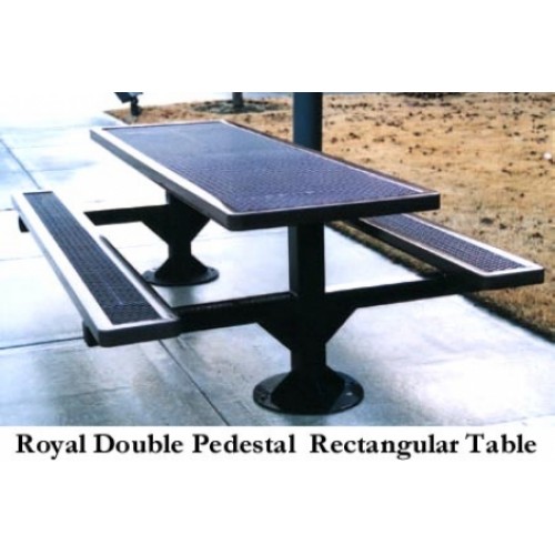 8 foot Table, 2 Attached 6 foot Seats, Rounded Corners, .75 inch number 9 Expanded Metal, Two 4 inch Pedestal Frames, Inground mount Pictured is the T8RCDBLPEDSM.